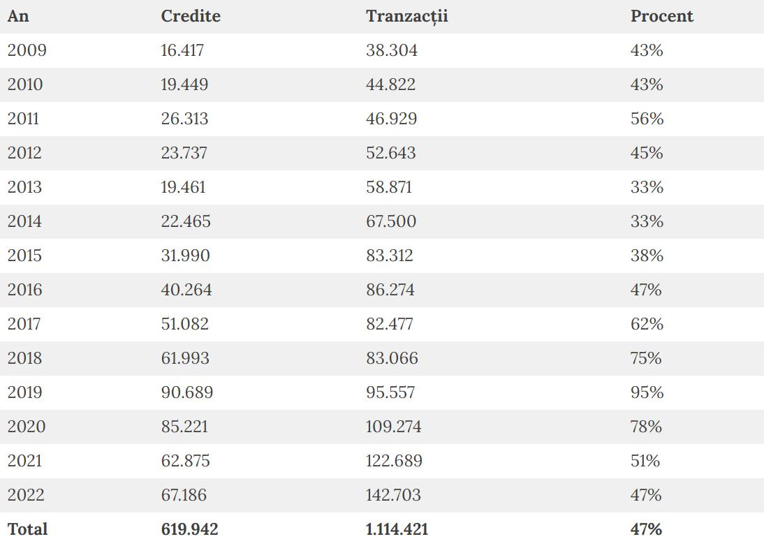 Astfel, am preluat de pe site-ul oficial al Agenției Naționale de Cadastru și Publicitate Imobiliară (ANCPI) datele referitoare la numărul de credite imobiliare contractate în București în fiecare an începând din 2009, iar apoi le-am comparat cu numărul total de tranzacții.
