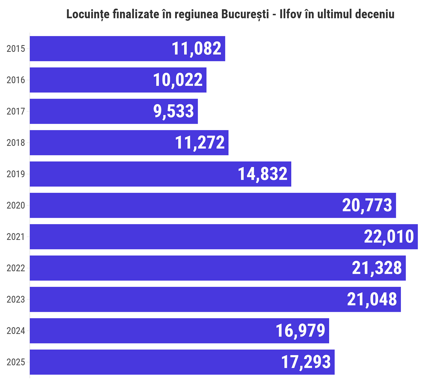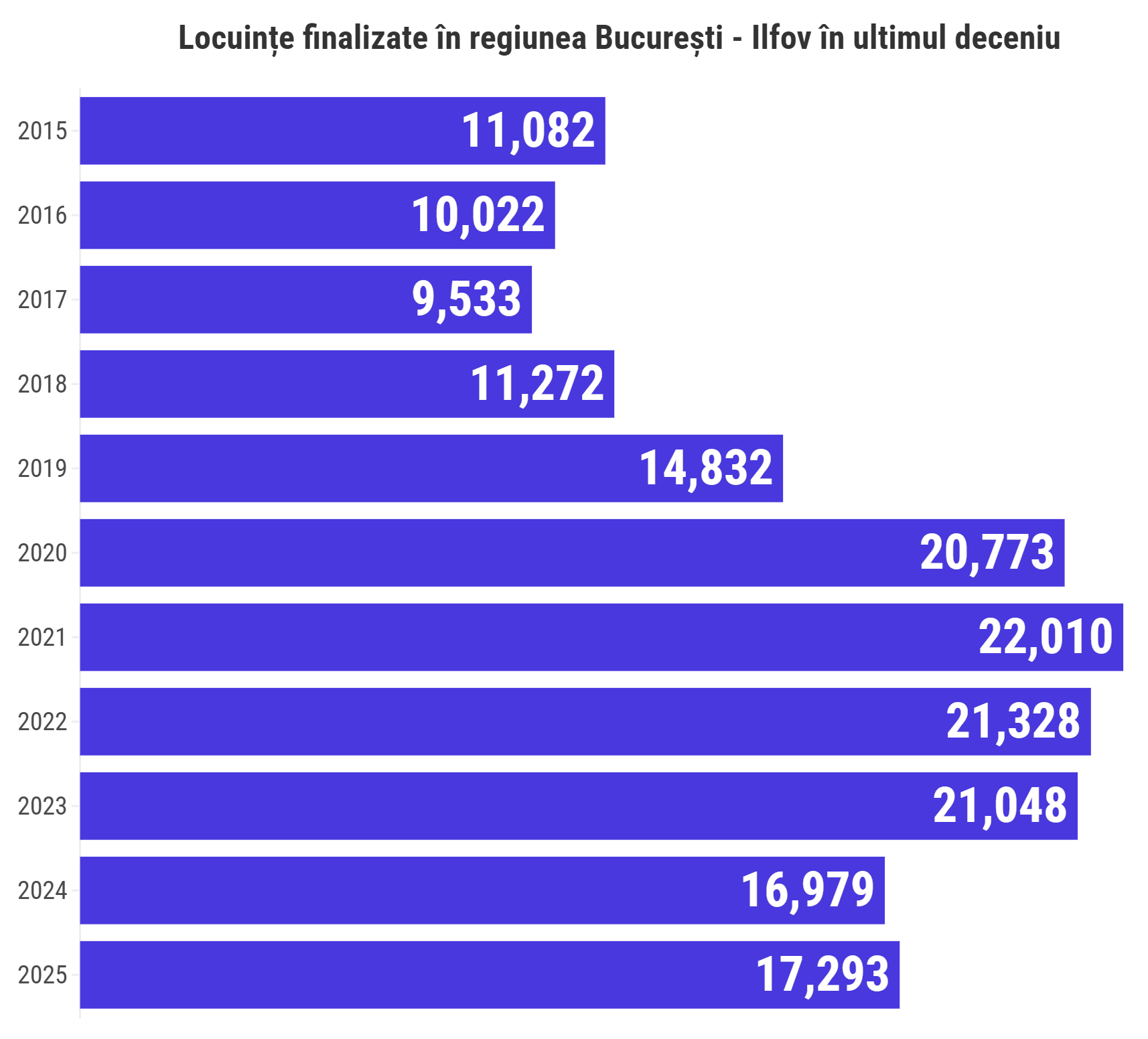 Datele pe ultimul deceniu arată că în regiunea București - Ilfov au fost construite anual între 10.000 - 11.000 de locuințe între 2015-2018, pentru ca în perioada 2020-2023 numărul să fie de aproximativ două ori mai mare și depășească în fiecare an 20.000 de locuințe.