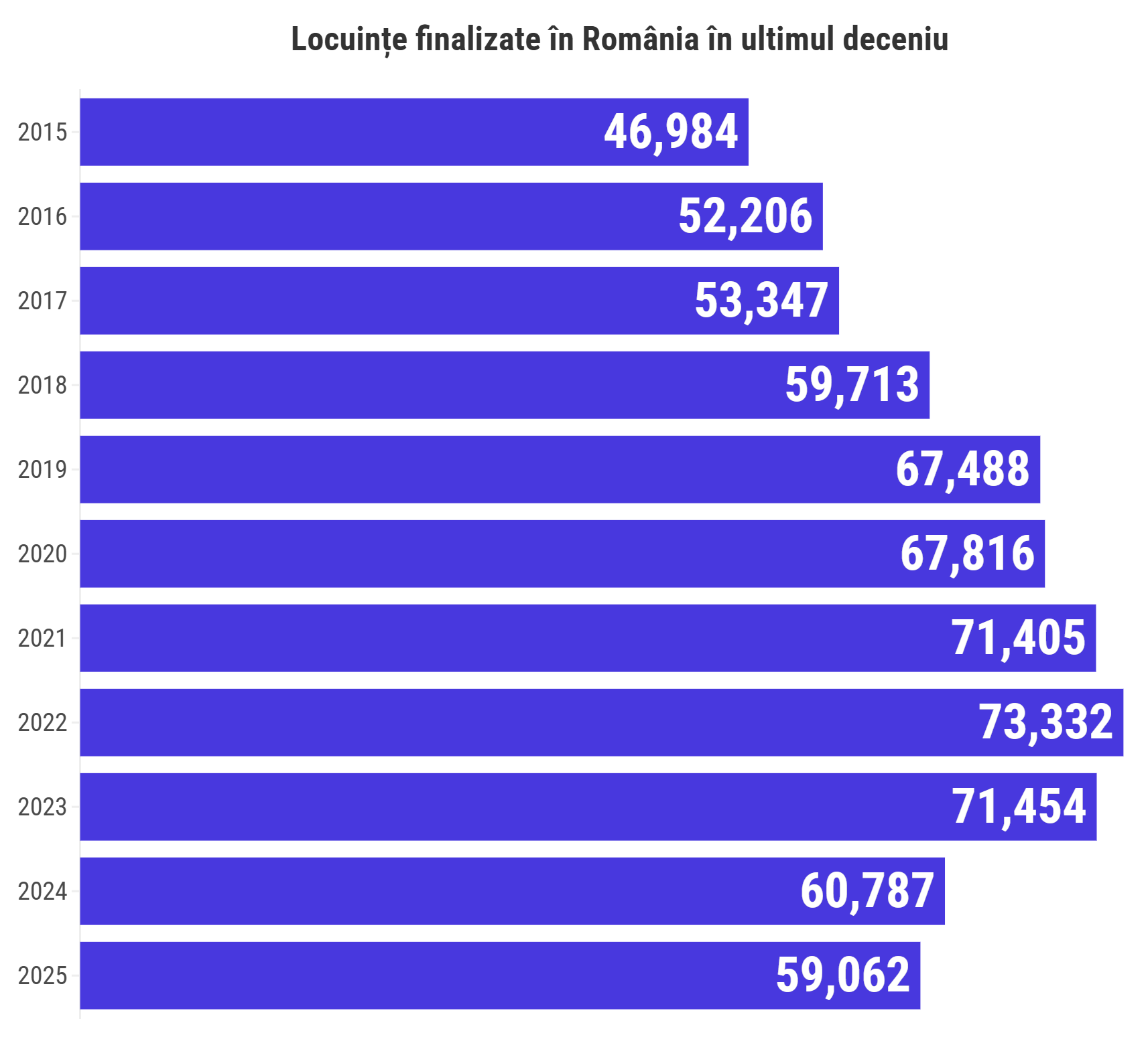 La nivel național, cel mai bun an pentru construcția de locuințe a fost 2022, când au fost finalizate peste 73.300 de locuințe. Practic, în 2025 au fost livrate cu 19,5% mai puține locuințe comparativ cu 2022.
