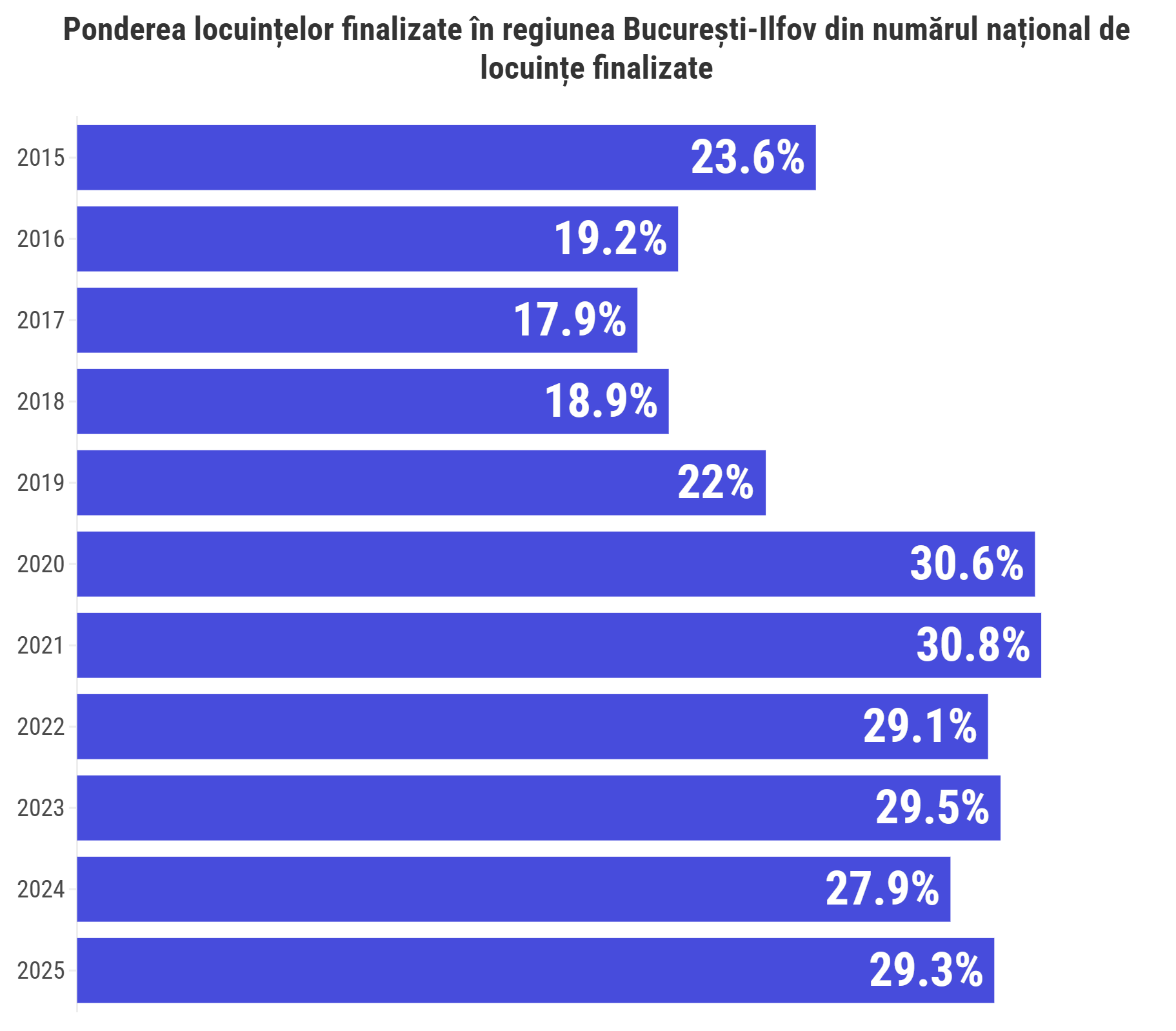 Pe baza acestor date am calculat ponderea locuințelor din regiunea București - Ilfov la nivel național. Astfel, anul trecut, 29,3% dintre locuințe au fost finalizate în București și Ilfov, iar această pondere este în ușoară creștere comparativ cu anul 2024, când era de 29,7%.