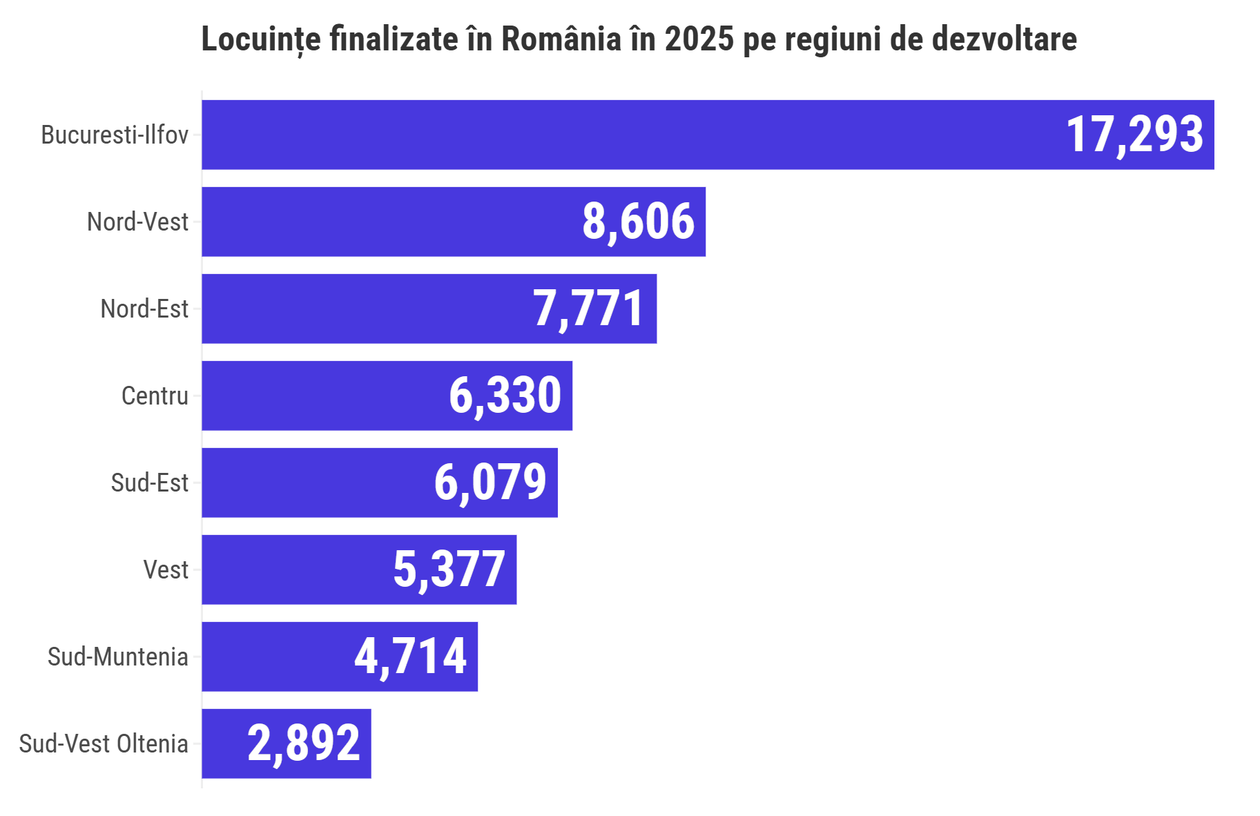 La polul opus, în regiunea Sud-Vest Oltenia, în care se află județe precum Dolj și Vâlcea, au fost finalizate cele mai puține locuințe (aproape 2.900).