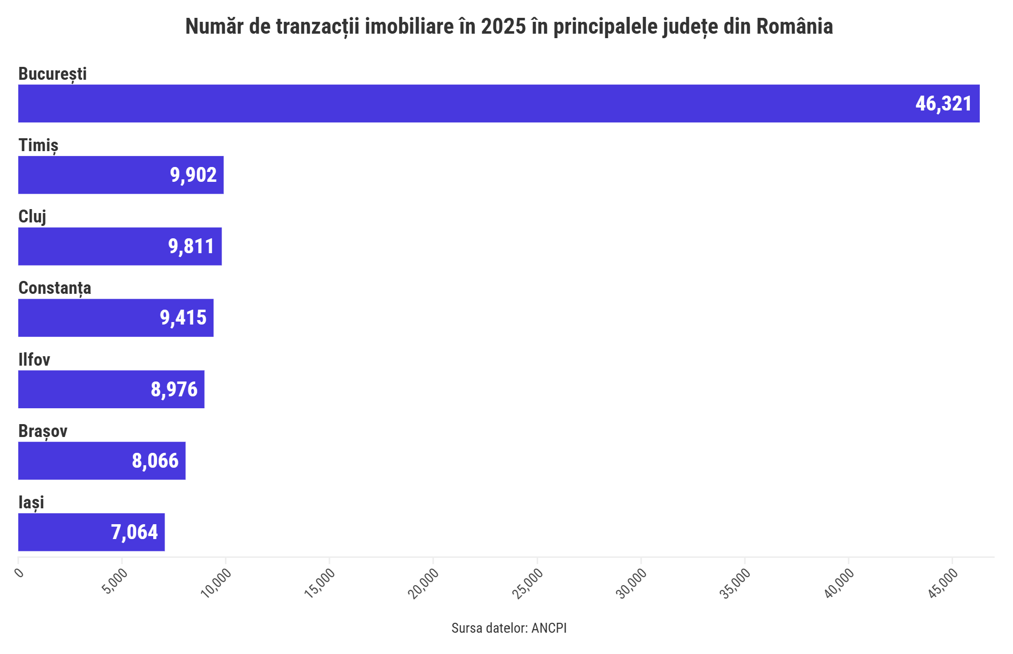 Singurul județ relevant pentru piața imobiliară care a înregistrat o creștere a numărului de tranzacții a fost Cluj (+2%), în timp ce în București tranzacțiile au scăzut cu 9%.