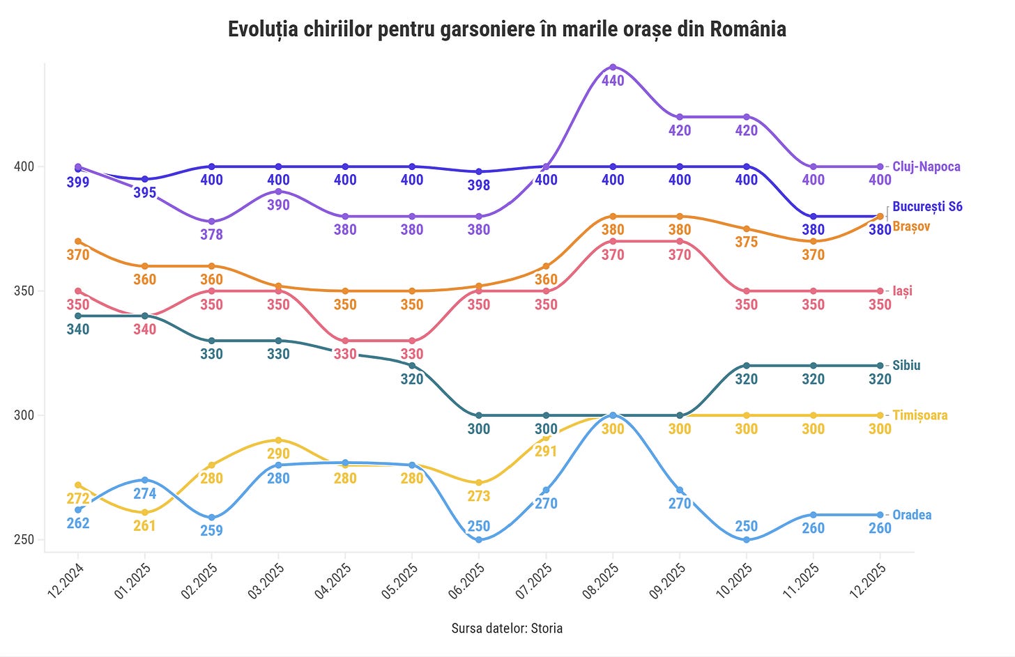 În schimb, pe parcursul ultimului an, chiriile pentru o garsonieră au scăzut în Oradea (260 euro, -1%) și, mai ales, în Sibiu (320 euro, -6%), în timp ce prețurile au stagnat în Cluj-Napoca (400 euro) și Iași (350 euro).
