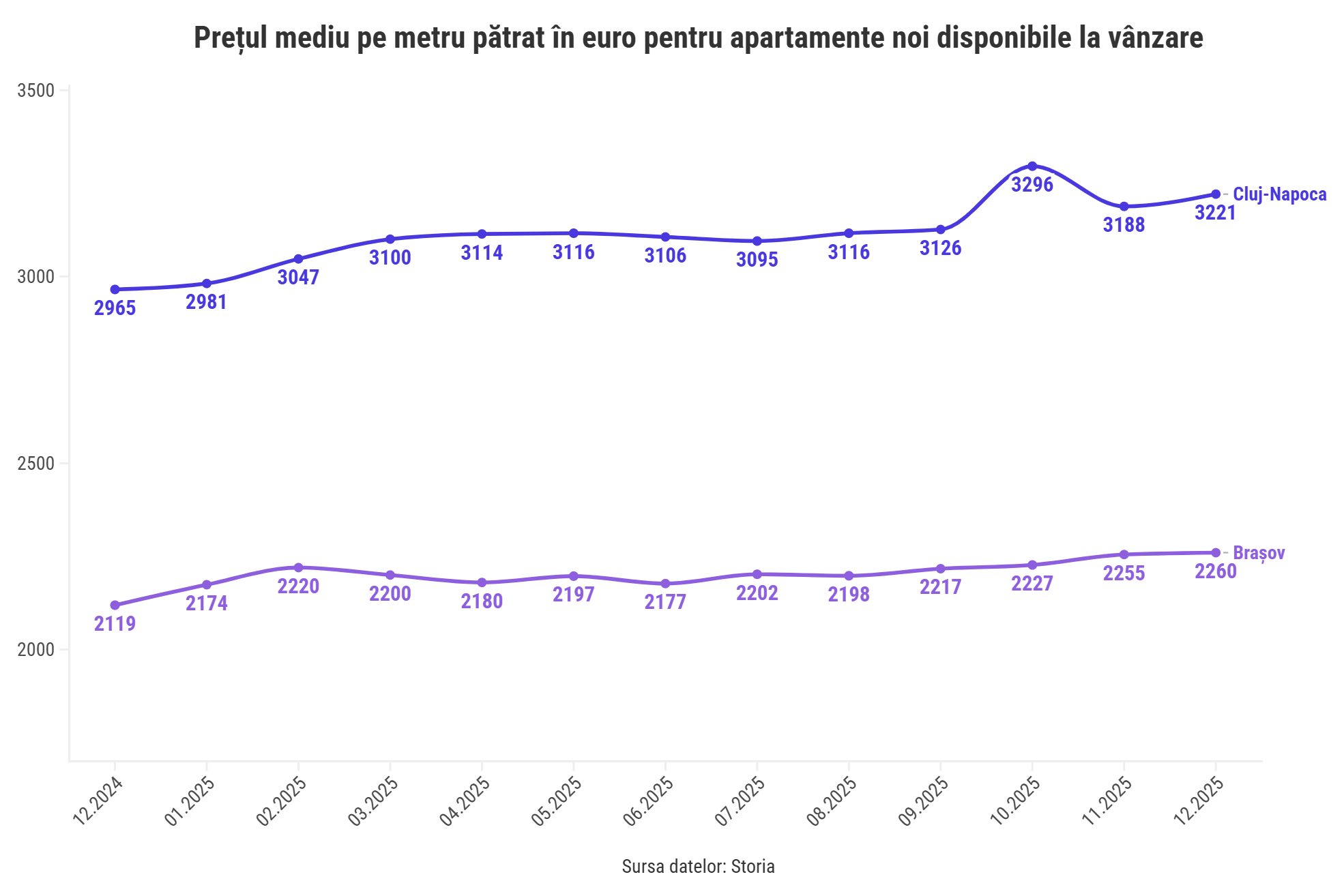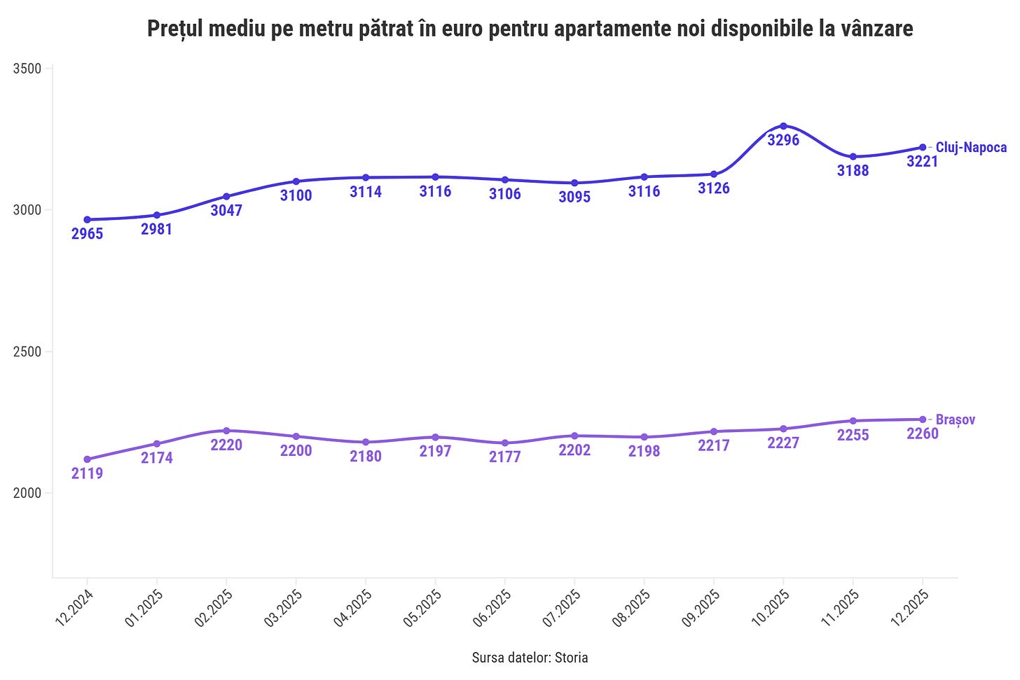 Între timp, Cluj-Napoca rămâne cel mai scump oraș din România cu un preț mediu de 3.221 euro pe metru pătrat (+9%), urmat de Brașov cu 2.260 de euro pe metru pătrat (+7%).