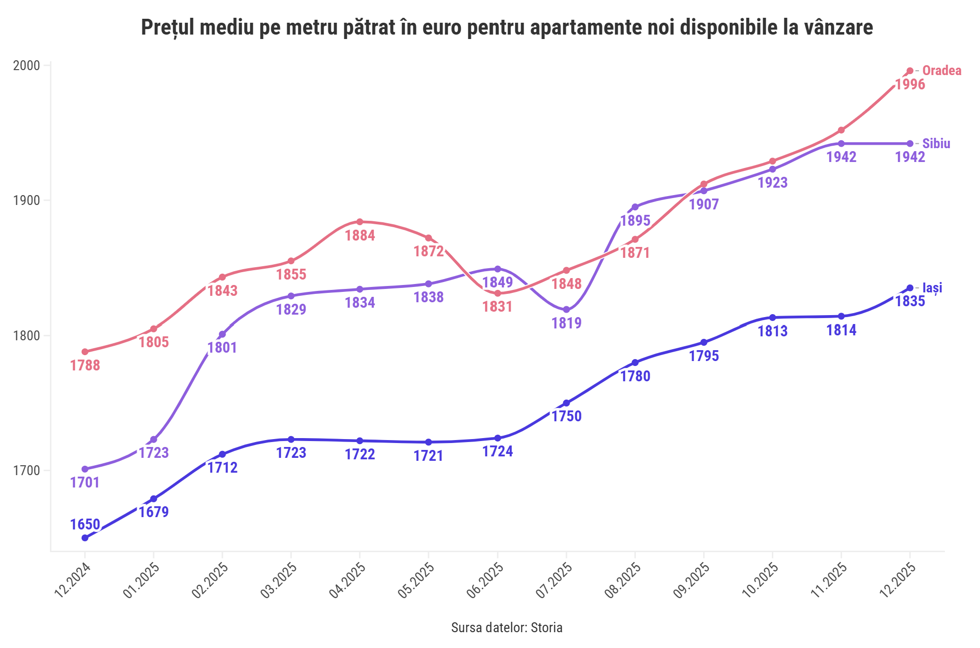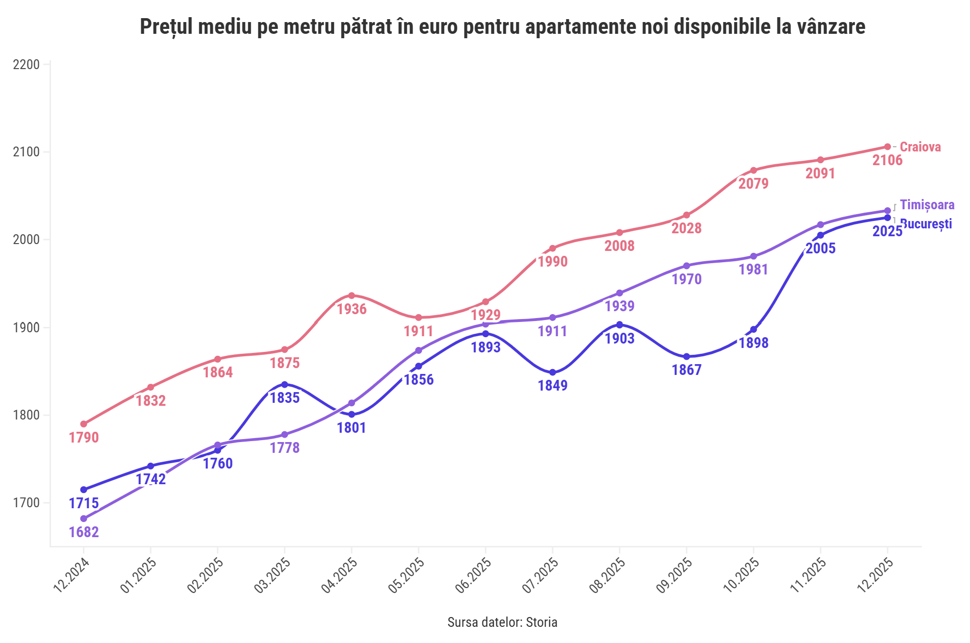 De exemplu, pentru segmentul de locuințe noi, datele pentru București pentru decembrie 2025 arată un preț mediu de 2.025 de euro pe metru pătrat, cu 18% mai mult comparativ cu decembrie 2024. Alte două orașe au depășit de asemenea pragul psihologic de 2.000 de euro pe metru pătrat în anul recent încheiat: Craiova (2.106 euro, +17%) și Timișoara (2.033 euro, +21%).