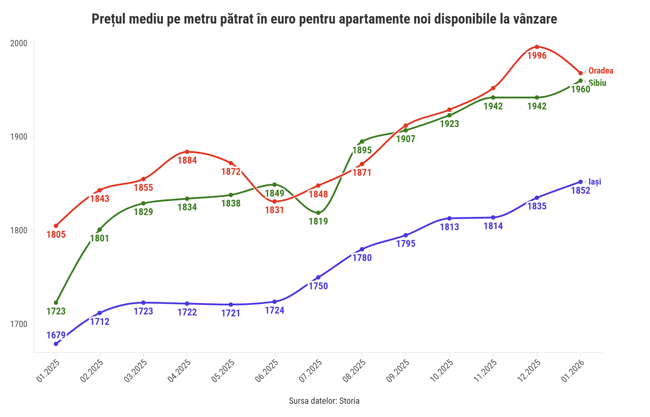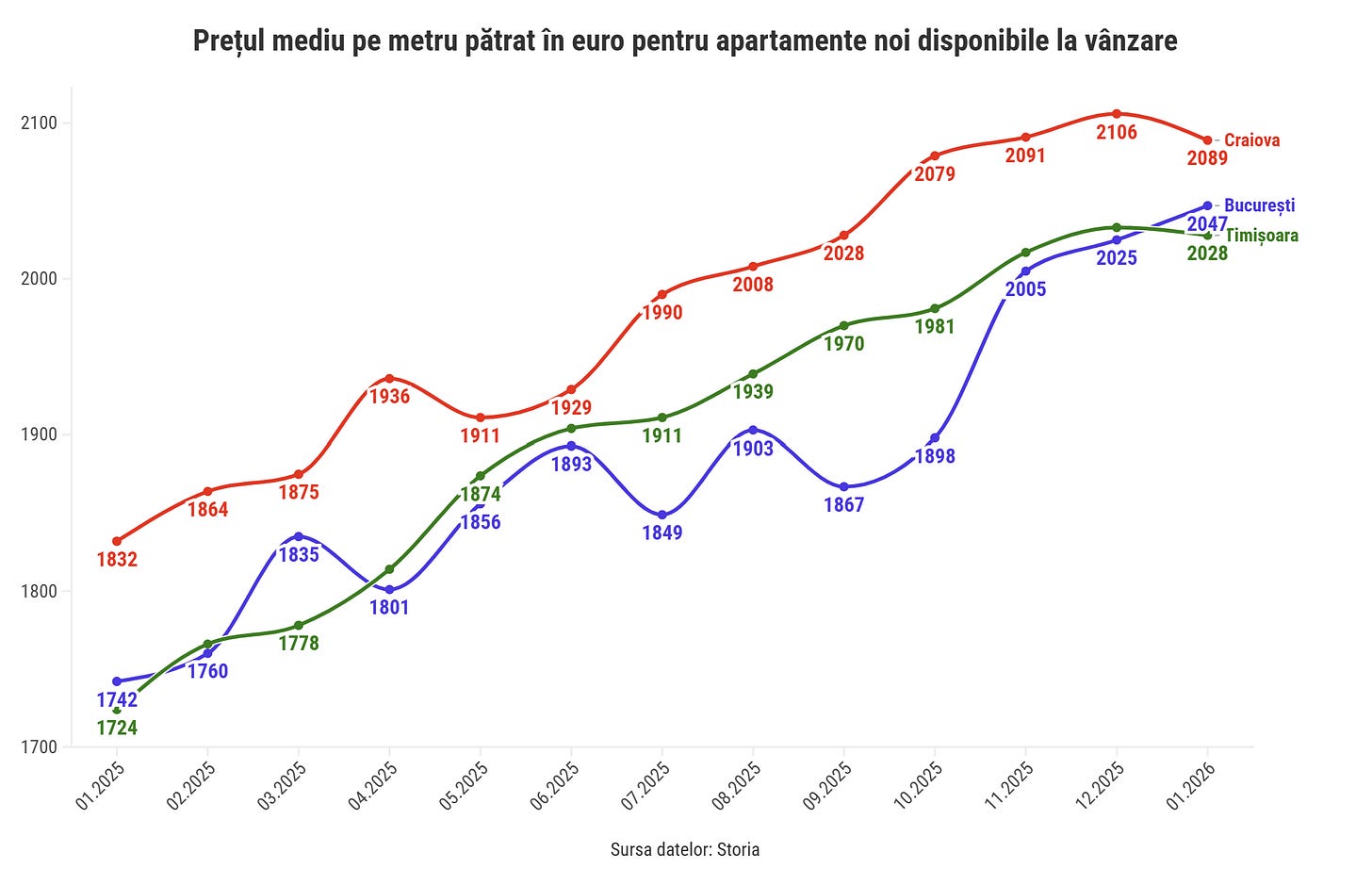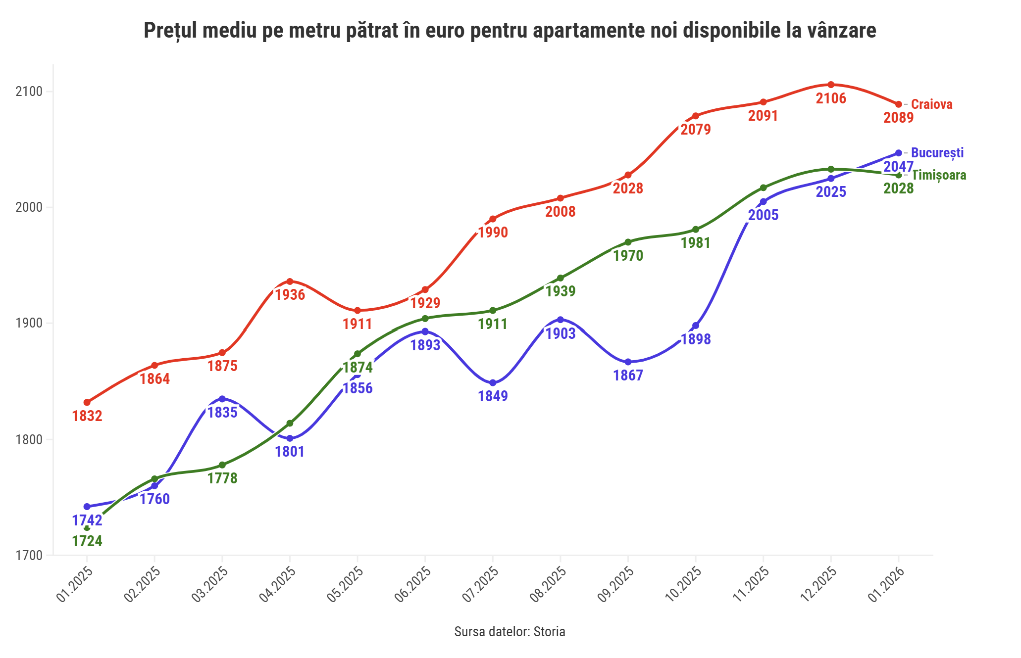 Astfel, în ianuarie 2026, prețurile medii pentru locuințe noi au crescut în Cluj-Napoca (+1,2%), Brașov (+0,4%), București (+1,1%), Sibiu (+0,9%) și Iași (+0,9%) comparativ cu decembrie 2025. În același timp, prețurile solicitate au scăzut ușor în Craiova (-0,8%), Timișoara (-0,2%) și Oradea (-1,4%). Cu această ocazie, prețul mediu din București a devenit mai mare decât cel din Timișoara pentru prima oară după aprilie 2025.