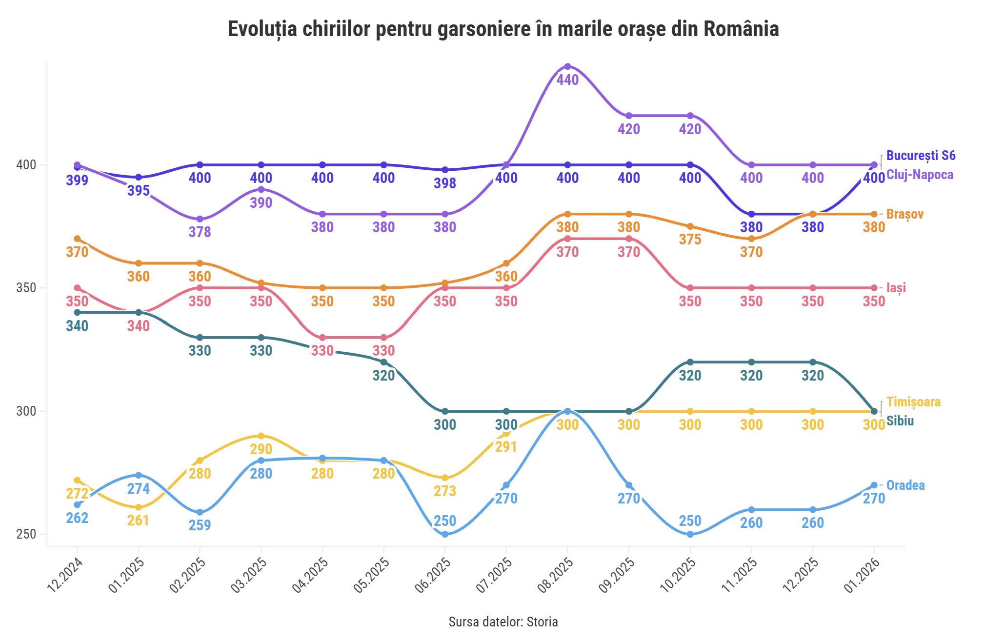 Între timp, în ianuarie 2026, chiriile pentru o garsonieră au stagnat în patru dintre marile orașe ale țării: Cluj-Napoca, Brașov, Iași și Sibiu. Creșteri s-au înregistrat în București S6 (+5%) și Oradea (+3,8%), în timp ce în Sibiu au scăzut cu 6,3%.