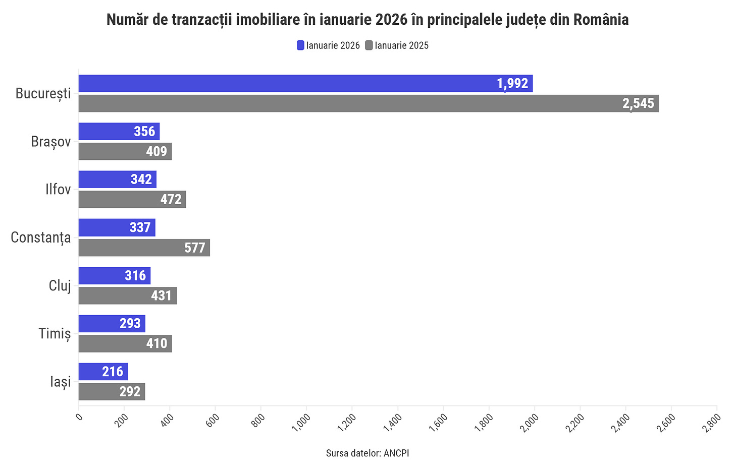Numărul de tranzacții imobiliare cu unități individuale a înregistrat o scădere cu 25% la nivel național în ianuarie 2026 comparativ cu ianuarie 2025. București a raportat o scădere cu 22%, în timp ce, dintre județele majore, Brașov a înregistrat cea mai mică scădere, cu 13%.