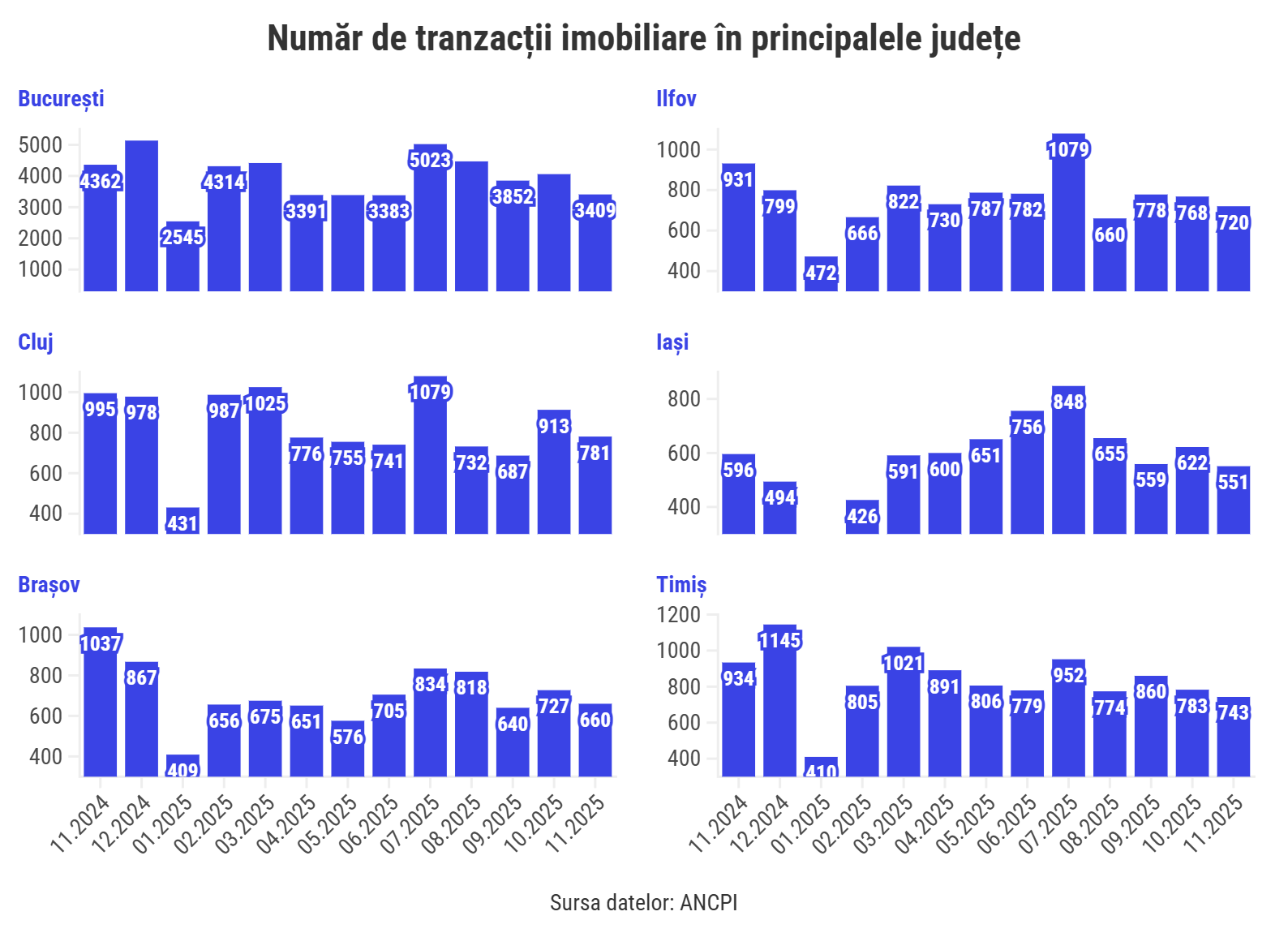 La nivel național au fost înregistrate puțin peste 12.000 de tranzacții, în scădere cu 22,5% vs. noiembrie 2024. Între timp, în București au fost raportate aproximativ 3.400 de tranzacții, cu 21,8% mai puține vs. noiembrie 2024.