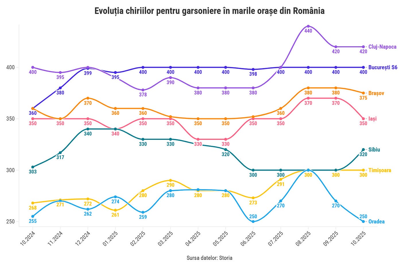Astfel, potrivit datelor centralizate de pe platformele Storia și OLX Imobiliare, chiriile pentru garsoniere au stagnat în octombrie comparativ cu septembrie în marile piețe imobiliare ale României, București (400 euro) și Cluj-Napoca (420 euro).
