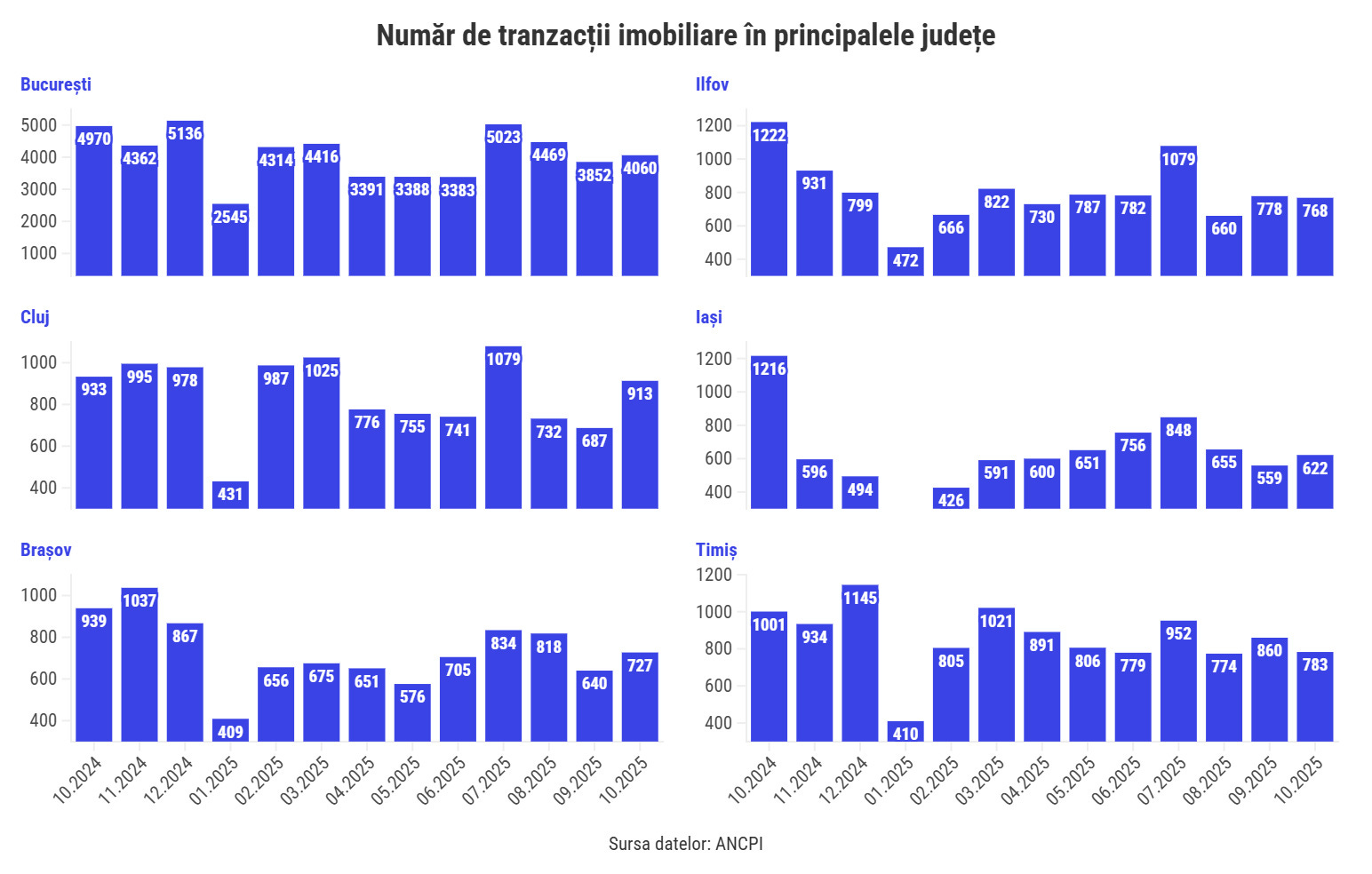 Scăderea a fost foarte aproape de media națională în București (-18%), însă marile județe au raportat în general scăderi mai mari, inclusiv Timiș (-22%), Brașov (-23%), Constanța (-30%), Ilfov (-37%) și Iași (-49%).