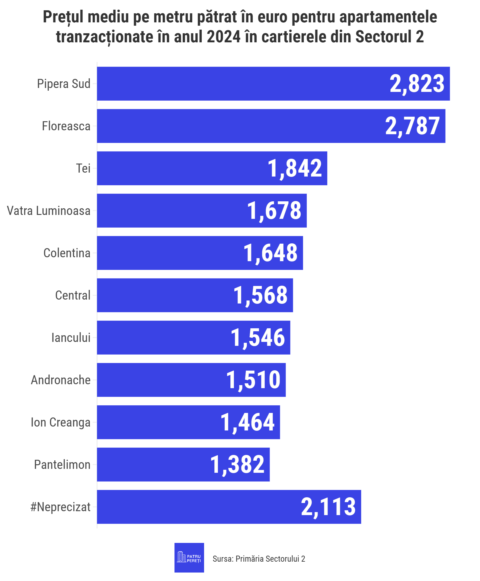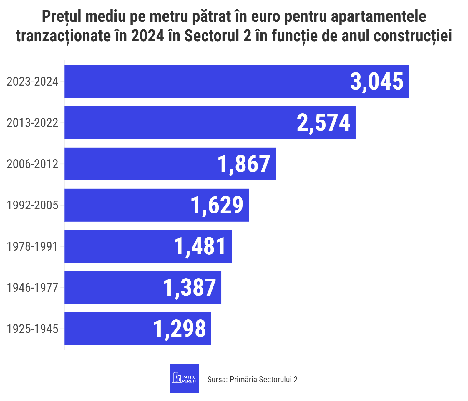 În total, în 2024, în Sectorul 2 au fost tranzacționate 4.244 de apartamente, iar prețul mediu ponderat a fost de 1.748 de euro pe metru pătrat util.