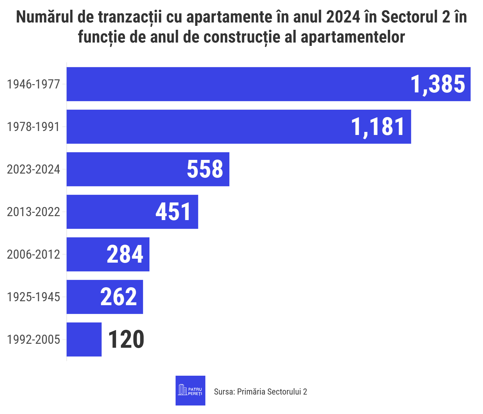 O treime dintre apartamentele tranzacționate în 2024 au fost construite în perioada 1945 - 1977, în timp ce mai puțin de un sfert au fost construite după anul 2013, un element care scoate în evidență că fondul locativ este relativ vechi.