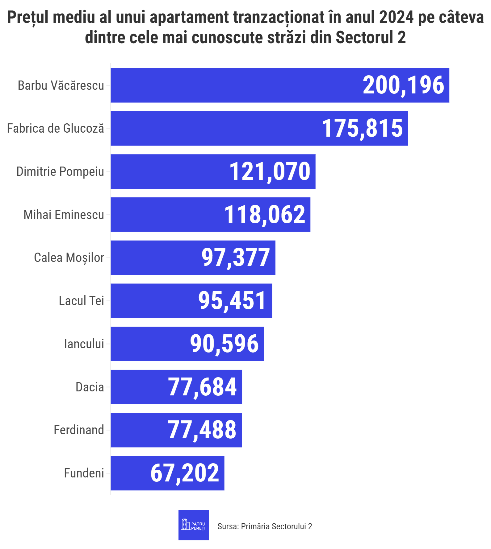 În final, am analizat și care au fost prețurile medii de vânzare pentru apartamentele de pe câteva dintre cele mai cunoscute străzi din Sectorul 2. De data aceasta nu am mai luat în calcul și suprafața utilă a acestora, ci doar prețul final al tranzacțiilor.