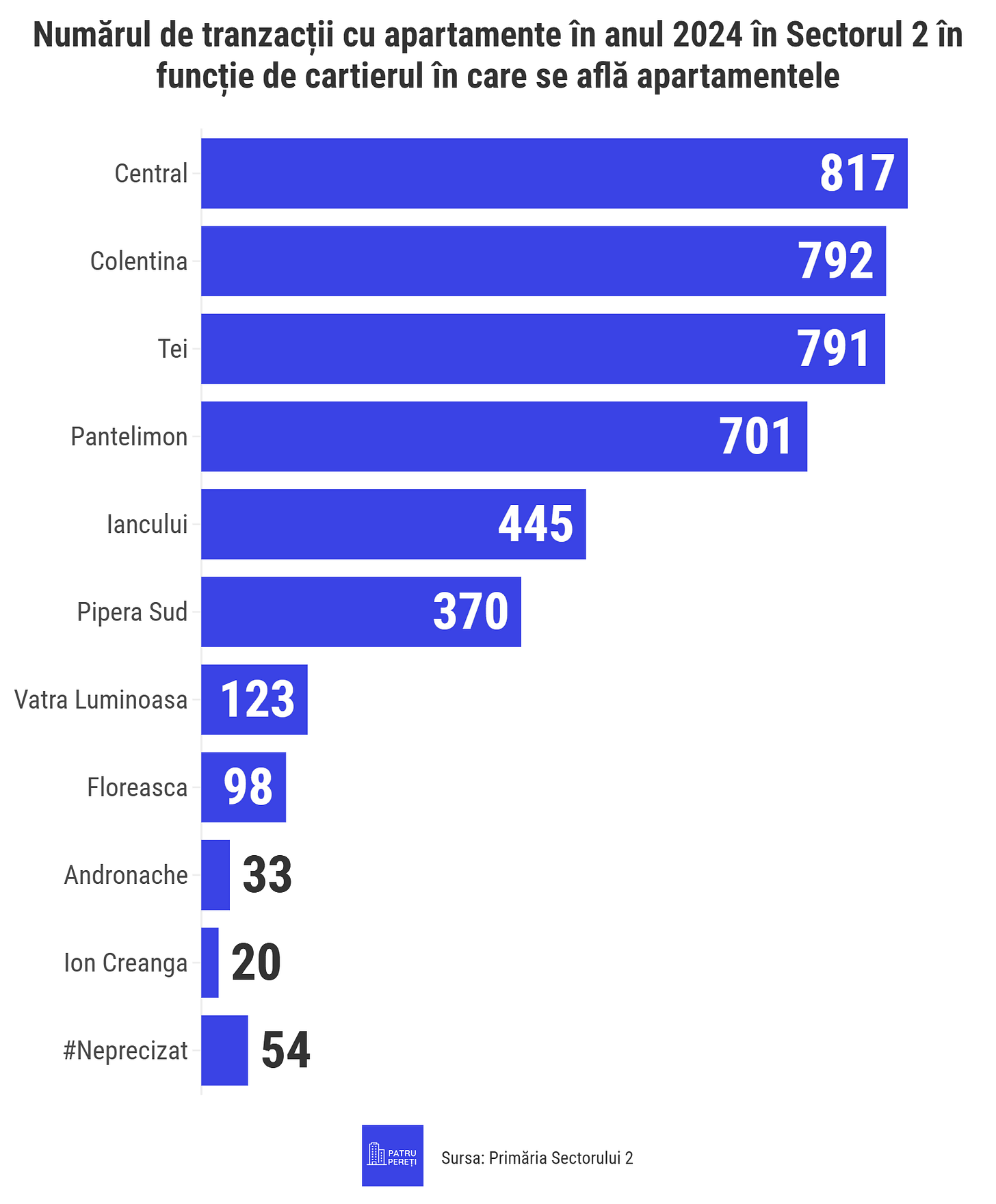 Ca pondere în numărul de tranzacții, peste jumătate dintre apartamentele tranzacționate în 2024 se află în zona centrală și în cartierele Colentina și Tei ale sectorului, fiecare dintre ele cu circa 800 de tranzacții.